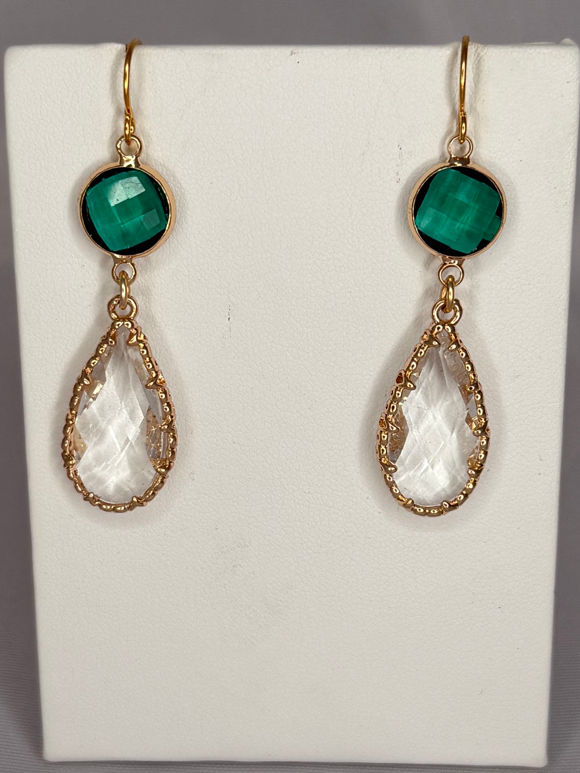 Vibrant emerald-tone glass paired with a faceted clear teardrop for a clean, classic pop of color. Lightweight and set in gold-plated, hypoallergenic metals for easy all-day shine.