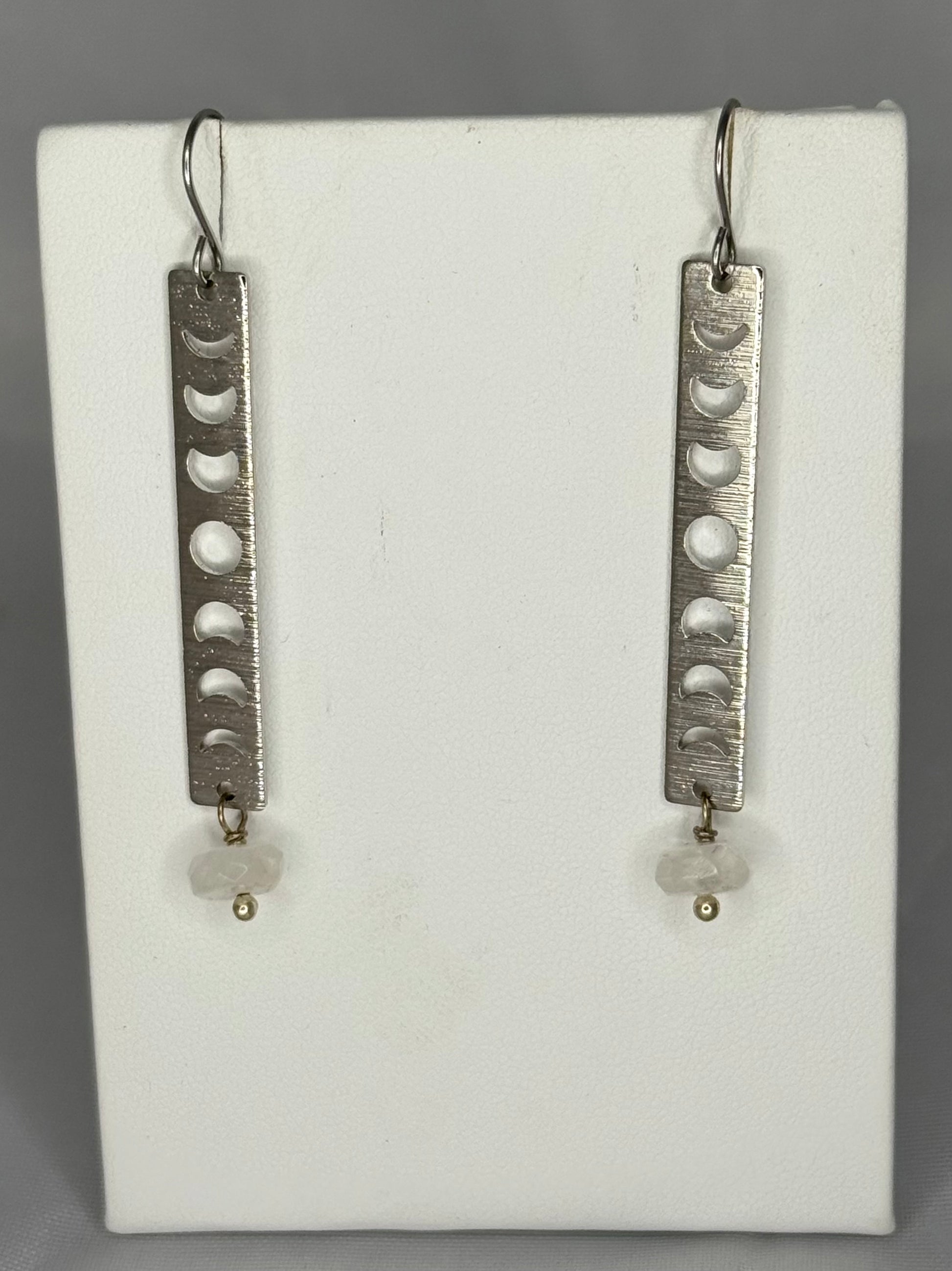 Brushed silver bars stamped with all eight moon phases, finished with a tiny moonstone accent for a touch of soft sparkle. Lightweight, celestial, and perfect for everyday wear on hypoallergenic hooks.