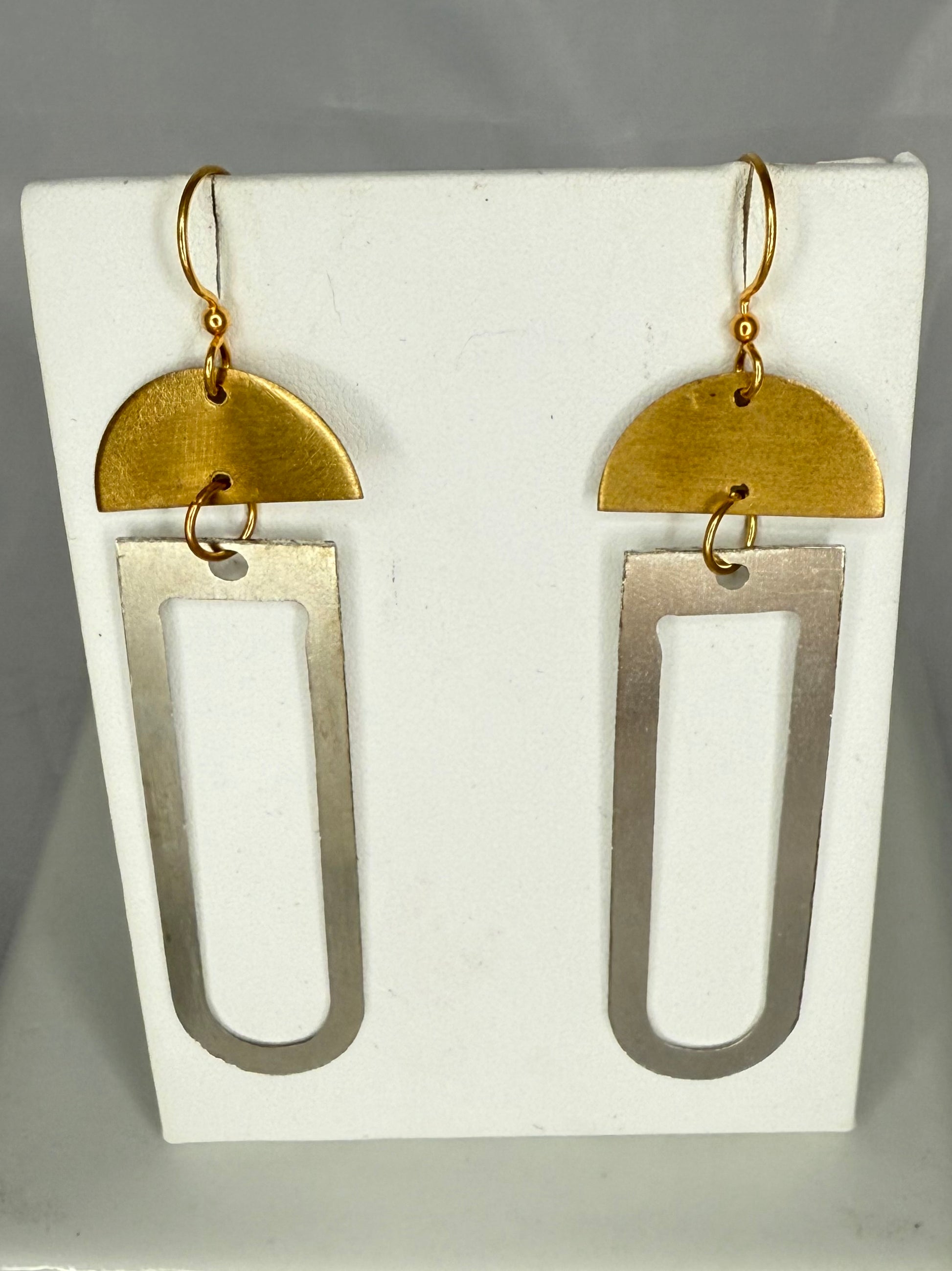 A modern mixed-metal moment. Matte gold half-moon shapes pair with brushed silver-tone elongated ovals for a clean architectural statement. Lightweight with beautiful movement, they bring effortless style to casual outfits and dressy looks alike.