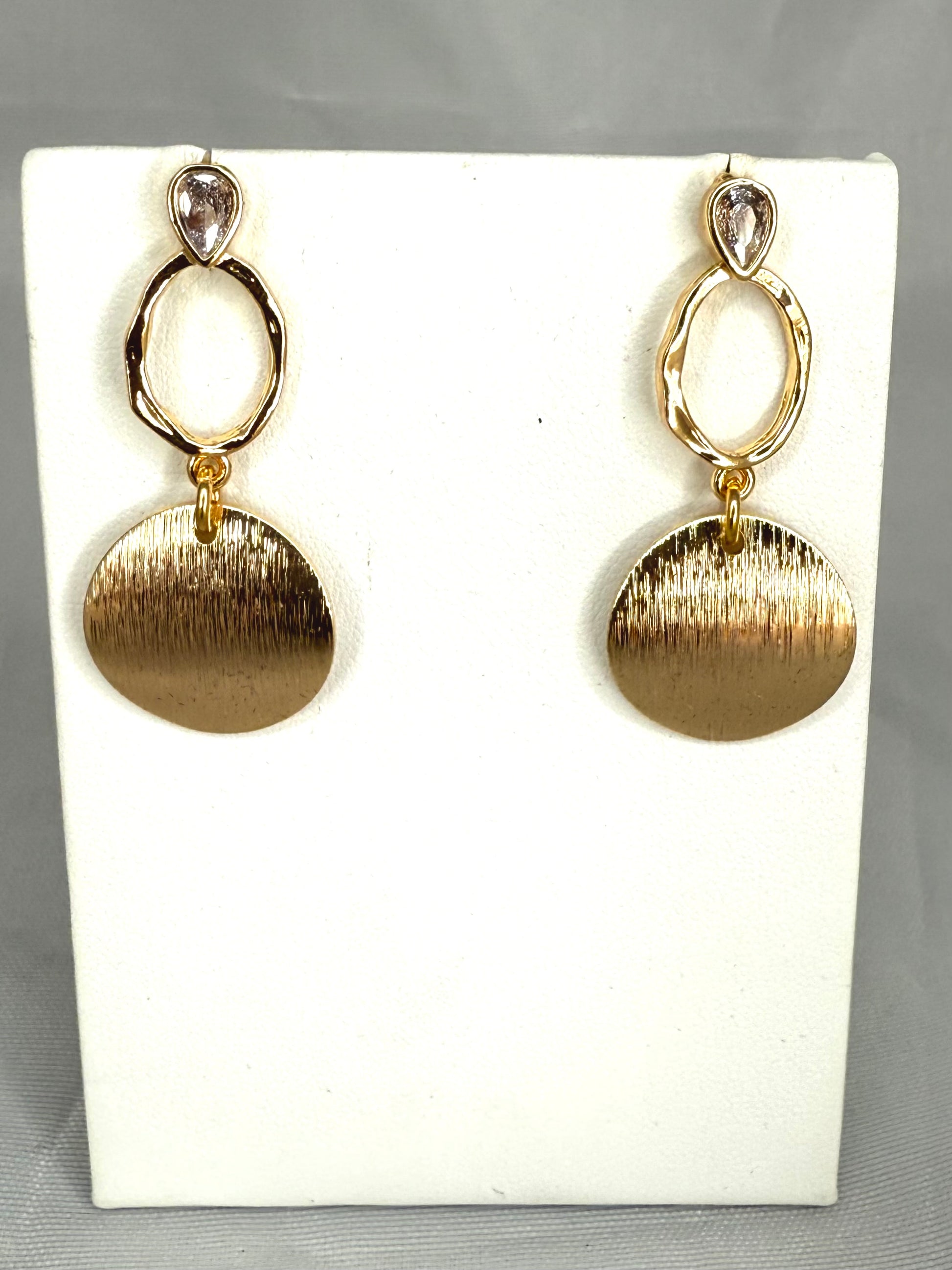 A soft shimmer with an organic twist. Brushed gold discs hang beneath hammered-look oval links topped with a tiny crystal accent. Modern, versatile, and lightweight, these earrings add a touch of golden glow to absolutely anything.