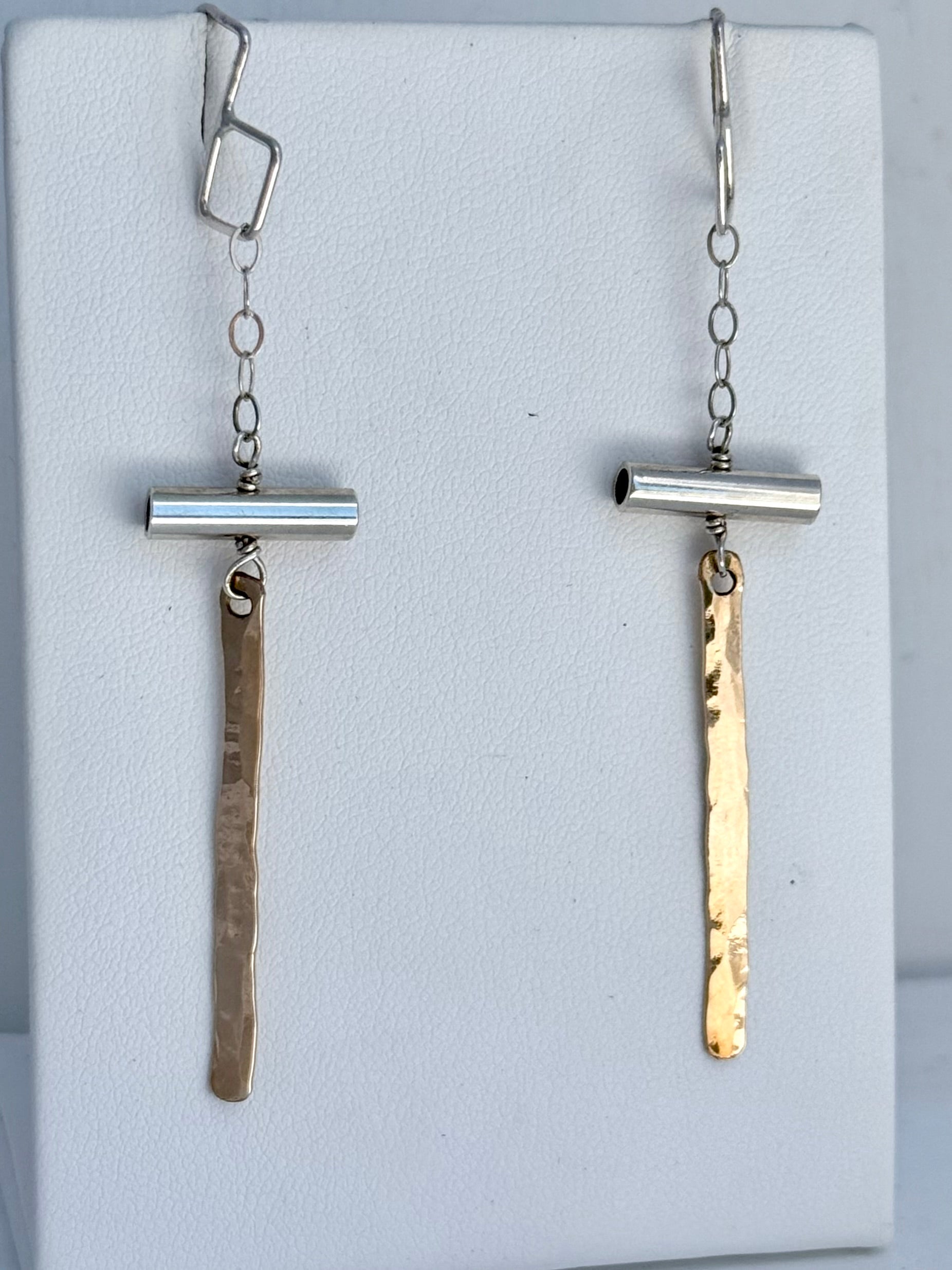 Geometric play meets kinetic elegance in these mixed-metal dangles. “Swing Shift” brings effortless cool to your look with a hammered gold-filled bar suspended from a sleek sterling silver T-bar and sculptural chain. No two days—or earrings—need to match perfectly to make an impact. 2.75"