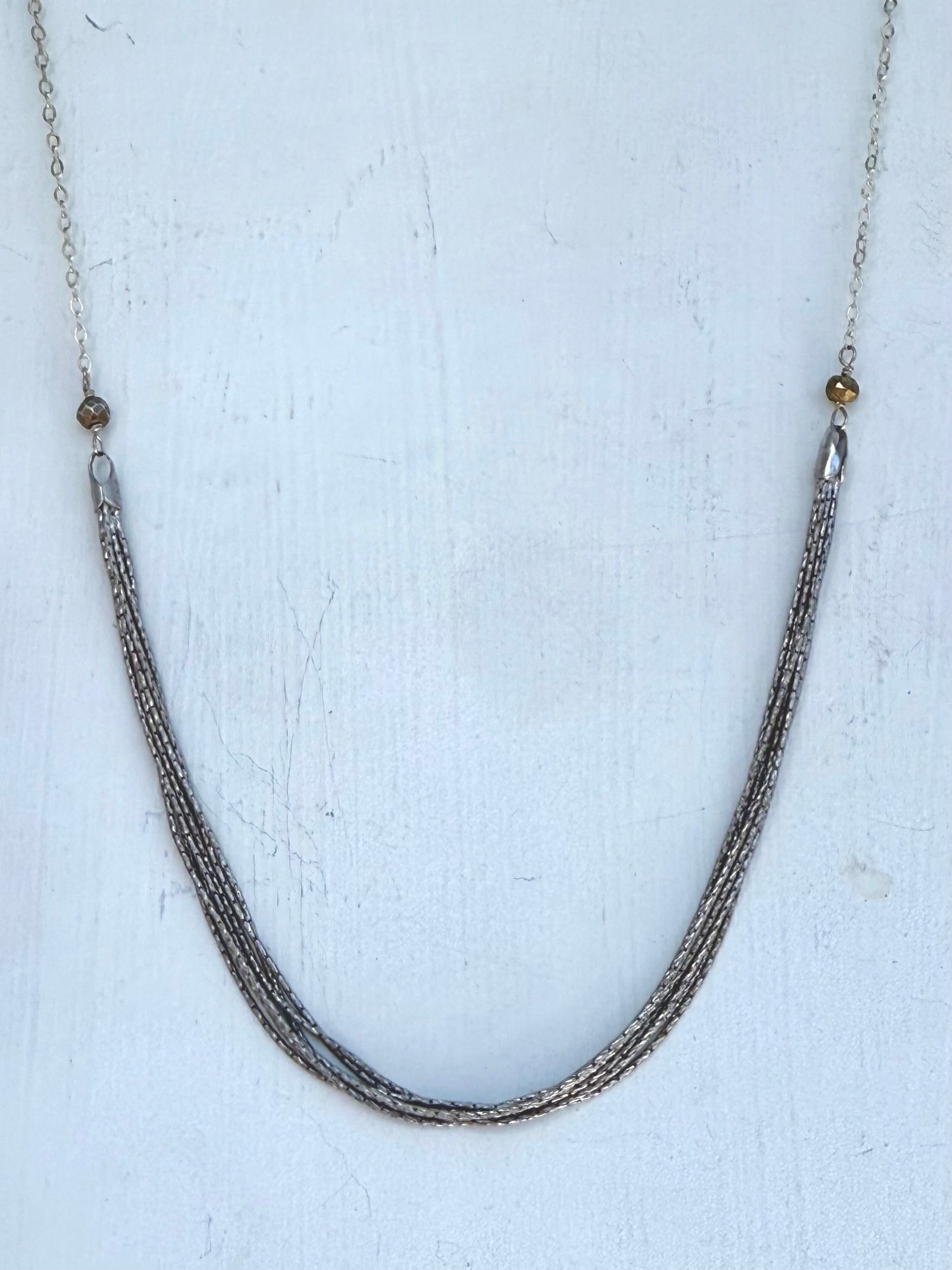 Delicate strands of sterling silver chains fall in a layered arc, anchored by faceted Spinel stones. Lightweight and elegant with quiet complexity—ideal for refined everyday wear.